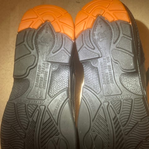 Sievi sneakers i storlek 42. Skorna är svarta med detaljer i grått och orange. De har kardborreknäppning över foten och vadderad krage för ökad komfort. Yttersulan är mönstrad för bättre grepp. Passar som vardagsskor eller arbetsskor beroende på behov.