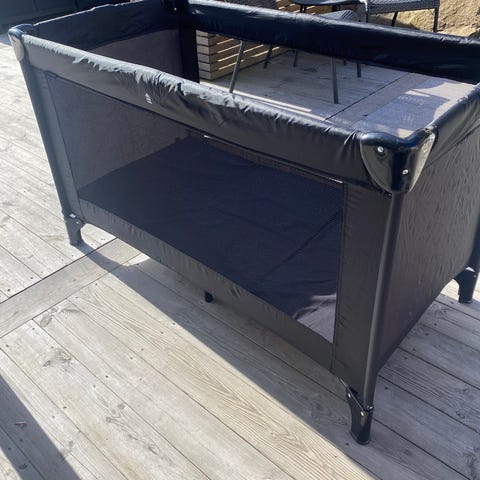 JYSK resesäng i svart tyg med ram i metall och plastdetaljer. Sängen är avsedd för barn och fungerar som en praktisk extrasäng vid resor eller övernattningar. Tyget omsluter hela liggytan och sängen har ben med stabil konstruktion. Passar för inomhusbruk och kan fällas ihop för förvaring och transport enligt tillverkarens anvisningar på etiketten.