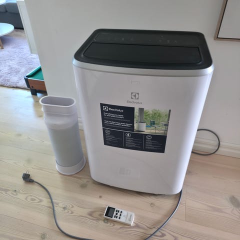 bladlös fläkt med inbyggd luftrenare i vit färg. Cylindrisk bas med perforerad frontsektion för luftintag och ett ovalt, öppet fläkthuvud utan synliga rotorblad. Enheten står på en rund fot och ansluts med nätsladd. Fjärrkontroll ingår enligt bild, vilket möjliggör styrning på avstånd.