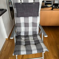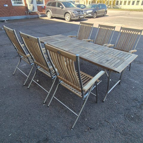4 st vita Brafab stolar med teak på armstöd, grå dynor. Förvaret inomhus på vintern. Fina och sköna att sitta i.