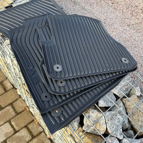 Bilmatta set gummimattor i svart färg. Setet består av fyra mattor anpassade för fram- och baksäte. Mattorna är tillverkade i gummi med upphöjda kanter och mönstrad yta framtill för bättre grepp och för att samla upp smuts och väta. Två av mattorna har fästhål för infästning i bilens golv. Passar som golvskydd i personbilens kupé. Helt nya. Oanvända. Kostar 700 kr nytt.