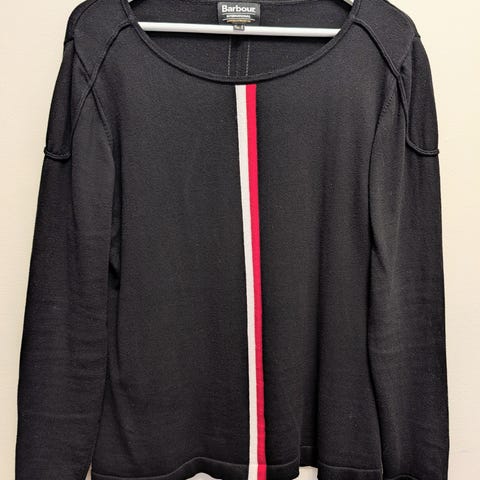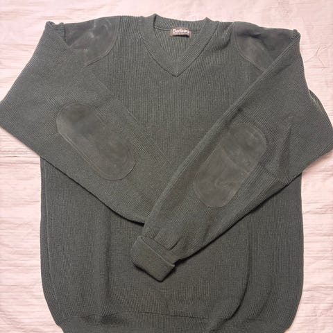 Barbour tröja för herr i storlek L. Stickad modell i blåmelerad färg, tillverkad i 100 % ull. Rund halsringning och ribbstickade muddar. Helt ny.