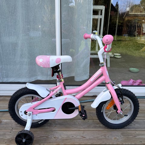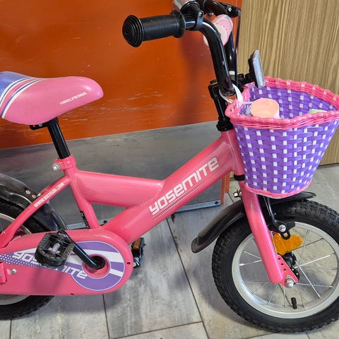 Yosemite barncykel med 12" hjul i rosa färg. Cykeln har stödhjul, kedjeskydd, skärmar fram och bak samt reflex fram. Lämplig som första trampcykel för mindre barn. Sadel och styre är justerbara i höjd för att kunna anpassas efter barnets längd. Finns i Ullared, Ny