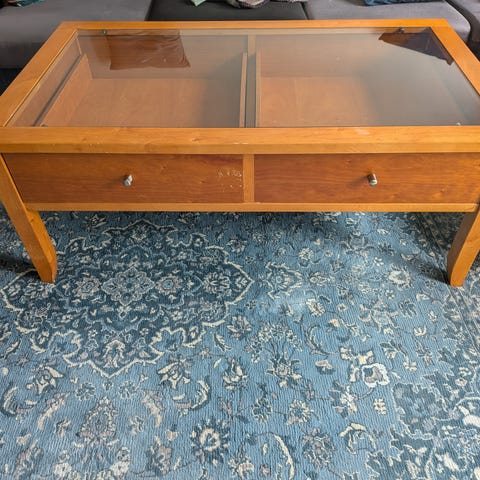 Vi säljer ett jättefint stort soffbord i massivt trä med 2 rutor av glas. Rejält och är I nyskick
