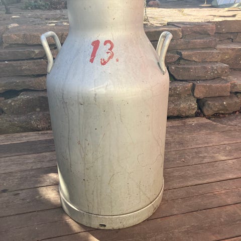 Okänd mjölkhink i aluminium. Klassisk modell med lock, bärhandtag upptill och sidhandtag för enklare lyft och tömning. Passar som behållare för vätskor eller som inredningsdetalj i lantlig eller industriell stil. Finns bulla på den!