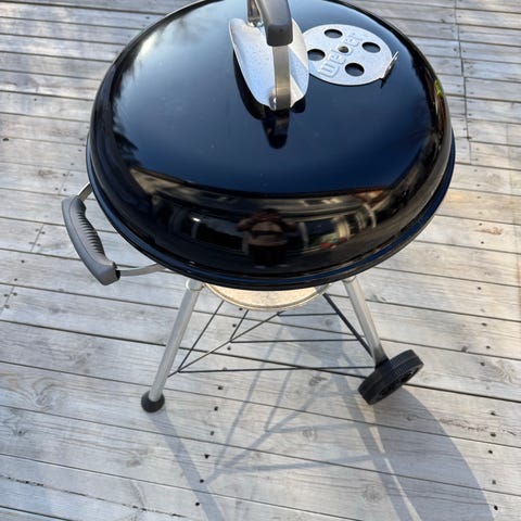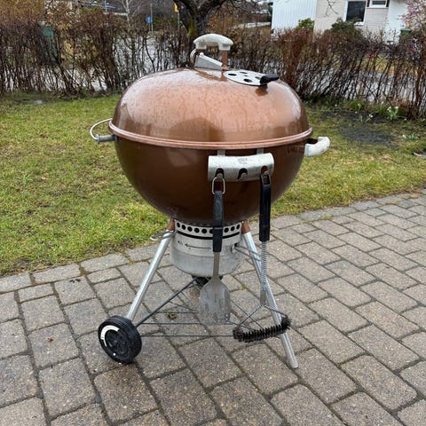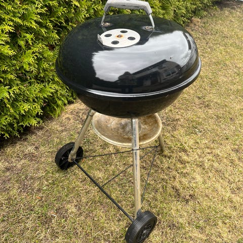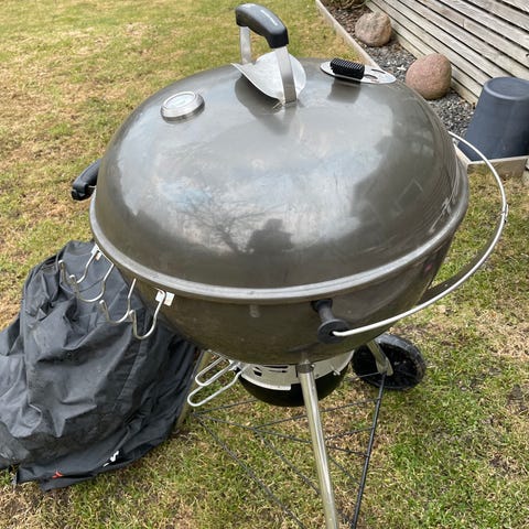 Weber klotgrill för kol, 57 cm. Grillen har lock med ventil och handtag samt handtag på sidan och benställning med två hjul för enkel förflyttning. Under grillen finns askfat/uppsamlare.