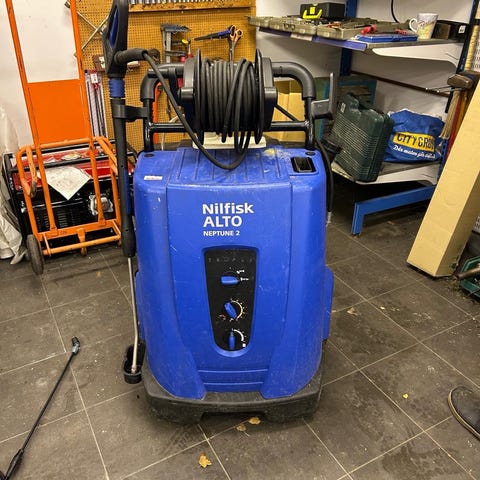 Nilfisk spolhandtag med högtrycksslang i svart plast. Handtaget har blå avtryckare och är avsett för användning med Nilfisk högtryckstvättar. Slangen är försedd med koppling i ena änden för anslutning till maskin och munstycke/förlängningsrör i andra änden. Passar för rengöring av till exempel bil, uteplats, fasad och trädgårdsutrustning tillsammans med kompatibel Nilfisk högtryckstvätt.