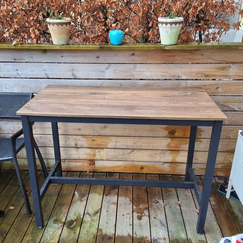 Bord för utomhusbruk med underrede i svart metall och skiva i någon sorts plast med betongliknande mönster. Fint till uteplatsen eller balkongen!