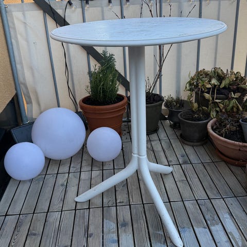 Runt bord med vit bordsskiva och metallunderrede. Bordet har tre böjda ben som möts i en mittpunkt för stabilitet. Passar exempelvis som mindre matbord, balkongbord eller cafébord i inomhusmiljö eller under tak utomhus beroende på materialets tålighet mot väder.