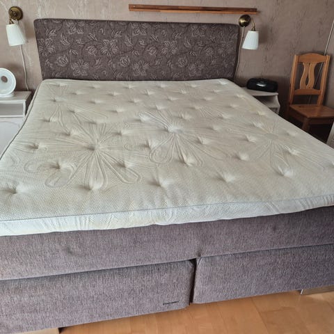 Själva sängen köptes i början av 2025, se kvittot på bild. På ena bäddmadrassen syns en liten missfärgning på två ställen, uppstod vid senaste flytten. Finns inga smutsfläckar i övrigt. Inga husdjur i hemmet.