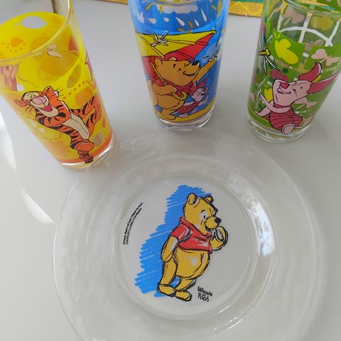 Dricksglasen är i bra skick, dock. Hela och fina. 10 cm höga.