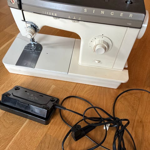 Singer symaskin modell 222K, även känd som Featherweight. Maskinen levereras med en bärväska och fotpedal. Medföljer gör även bruksanvisningar och diverse sytillbehör såsom spolar, nålar och olika pressarfötter. Motorn är specificerad för 220 Volt, 25-75 Cycles, AC & DC och är tillverkad i Storbritannien. Serienummer: EK632277. Säljes i mycket fint skick och fungerar klockrent.