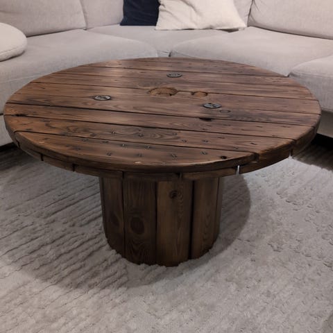 Runt soffbord tillverkat av en kabeltrumma i trä, målat i svart. Bordet har en rund bordsskiva med mittöppning och en stabil cylindrisk fot. I den nedre delen finns hyllplan/utrymmen som kan användas för förvaring av flaskor eller glas. Passar som soffbord eller sidobord i vardagsrum eller sällskapsrum. Lampa med rörelsesensor som tändes när man öppnar dörren.
