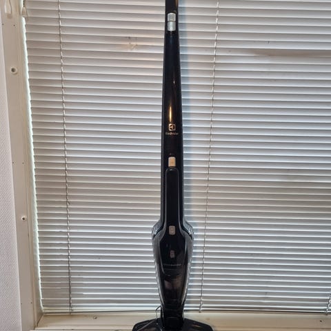Electrolux skaftdammsugare med integrerad handdammsugare i grå färg. Modellen är sladdlös vid användning och laddas i medföljande laddstation. Handenheten kan tas loss för mindre ytor, möbler och svåråtkomliga ställen. Passar för städning av hårda golv och mattor i hemmet.