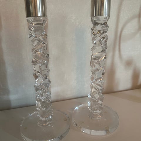 Orrefors ljusstakar i klart kristallglas. Ljusstakarna har rund fot och dekorativ, facetterad ljuspelare med metallhylsa i rostfri stål upptill för ljus. Passar för exempelvis kronljus och kan användas som bordsljusstakar i olika rum, till vardag eller vid dukning vid särskilda tillfällen.