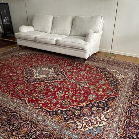 Kashan-mattorna hör till klassikerna inom persisk knypplingskonst, och kännetecknas av central medaljong, blommönster och färgskala i rött, blått och elfenben. Kom till Sverige ca 2010. Något nött, har legat i ett rök- och djurfritt hem.