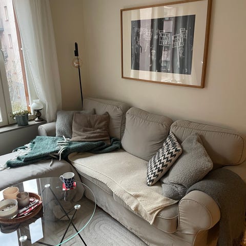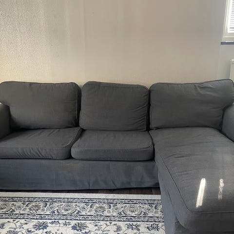 Ektorp soffa från IKEA, har hundar så det är en del fläckar på soffklädseln men den går att ta av och tvätta sen går det även att köpa ny klädsel om man vill.