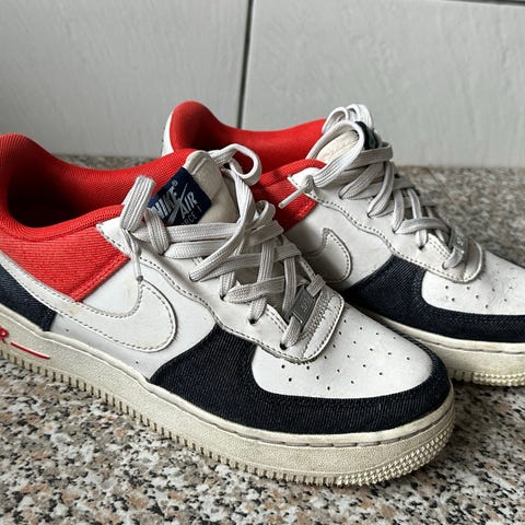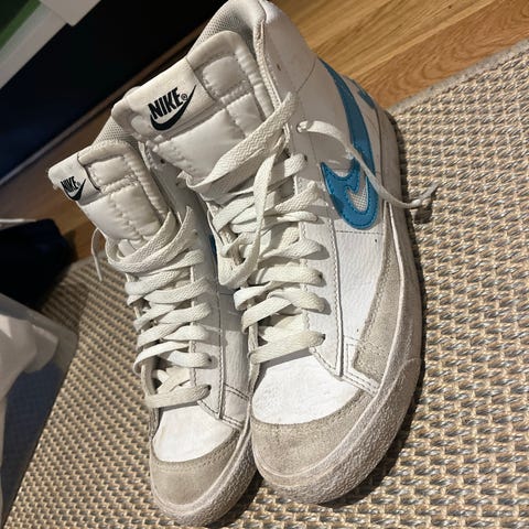 Nike sneakers för barn/unisex i storlek 38. Skorna är grå med ljusblå Nike-logga och vit yttersula. Snörning framtill och ovandel i syntet/läderimitation med perforerad tådel. Yttersula i gummi med mönster för grepp. Passar vardagsbruk och fritidsaktiviteter.