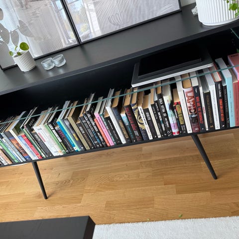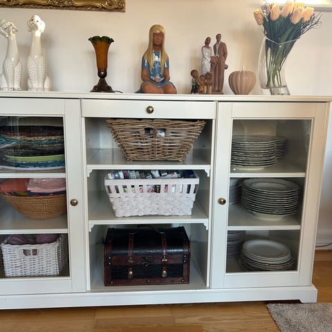 Sideboard/skänk i mörkbrunt trä. Möbeln har två dörrar med förvaringsutrymme, tre mindre lådor i mitten samt öppna hyllplan. Passar exempelvis som förvaring i vardagsrum, matsal eller hall. Viss slitage och märken på ytor och kanter förekommer enligt bilderna.