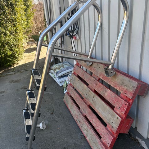 Badstege i rostfritt stål med två steg. Avsedd för montering på brygga, kaj eller poolkant. Stegen har rundade handtag upptill och fästs med medföljande monteringsplattor mot underlaget. Lämplig för nedstigning i vatten vid badplats eller vid båt.