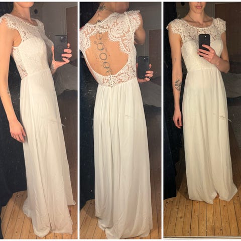 Ny m. lapparna kvar! Brudklänning i chiffong med spetsdetaljer och öppen rygg