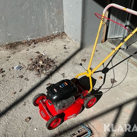 Bensindriven gräsklippare i röd färg med gultt handtag. Modellen har fyrhjulskonstruktion och manuell framdrivning. Passar för klippning av gräsmattor i trädgård och runt huset. Klipphöjd och klippbredd framgår inte av bilderna. Drivs med bensinmotor, startas med snörstart och manövreras via bygelhandtag. Speciell start funktion som kan vara svår att använda för den ovana,