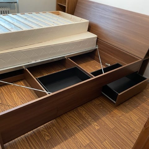 Själva sängstommen är i väldigt bra skick, men lådorna är mer slitna (se bilder). 1 av lådorna har även ena sidan av fronten lossnat på från träet, men har skruvat ihop den med vinkelbeslag (se bilder)