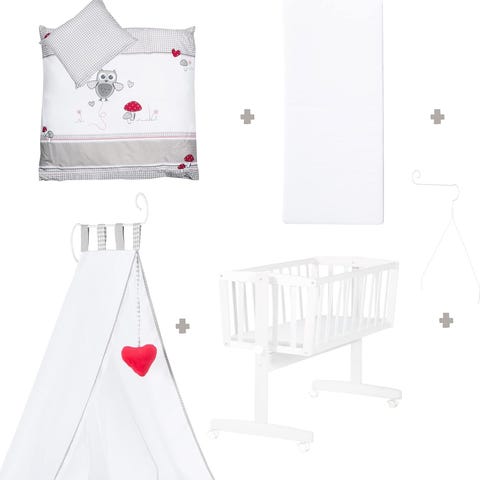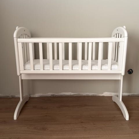 Roba vagga i vitlackat trä. Vaggan står på medar med hjul för enkel förflyttning och har en justerbar låsmekanism för att kunna låsa gungfunktionen. Med följer textilkant runt liggytan samt madrass i ljus färg. Passar spädbarn under den första tiden och kan placeras i sovrum eller barnrum som första säng.