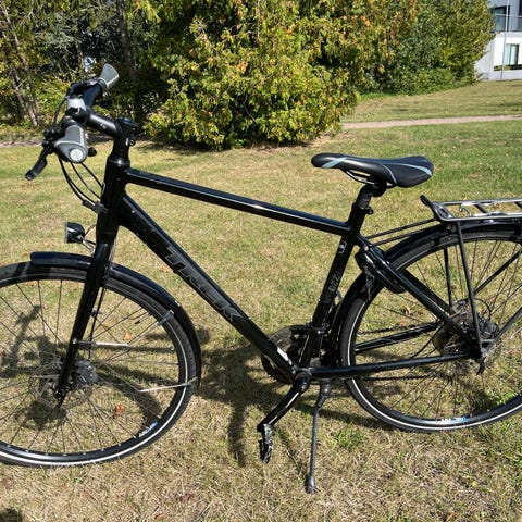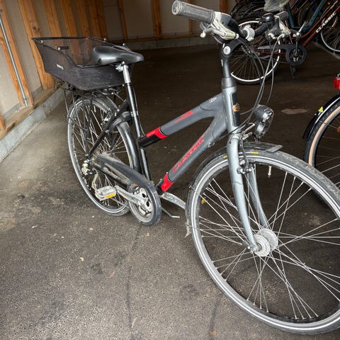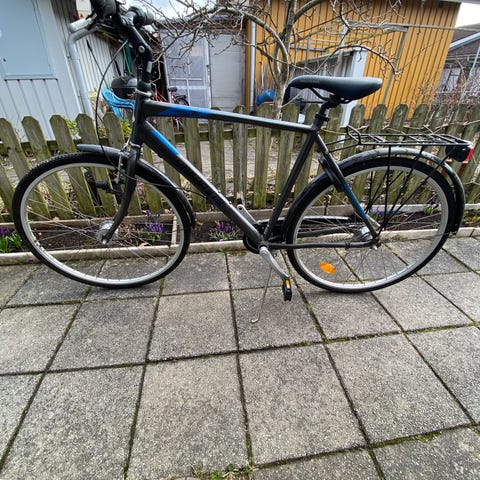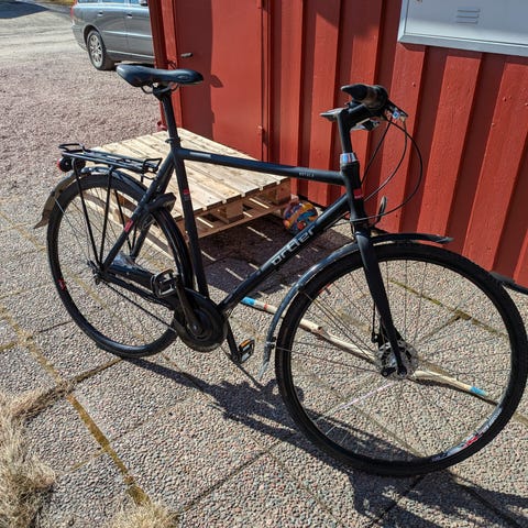 Bra skick. Servad för 450kr + nytt bakdäck. Belysning fram o bak. Storlek 52. Medium. Skivbroms fram o bak. 24 vxl