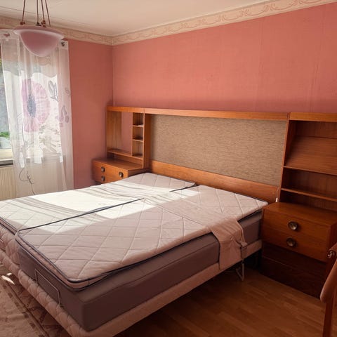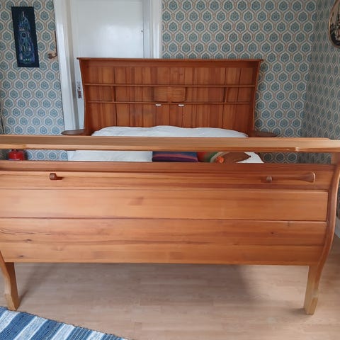 Sänggavel för dubbelsäng som är 180 cm med belysning. Två fotgavlar som fästs i sängbotten.