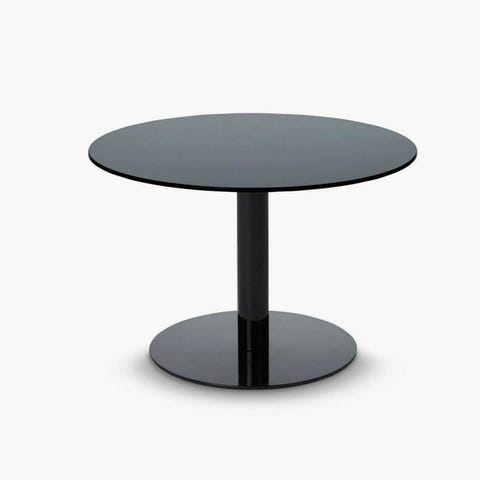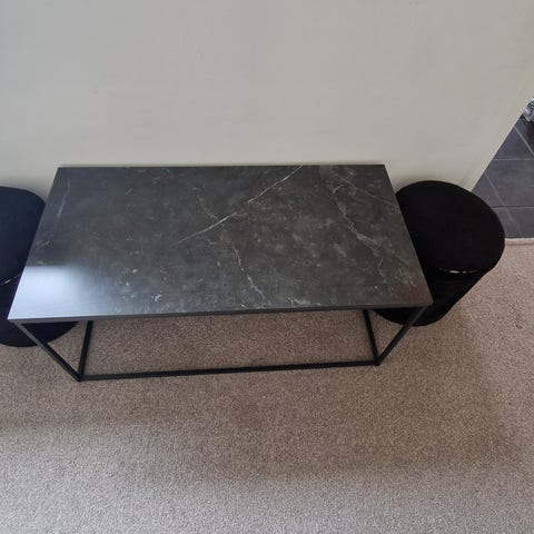 Ett elegant soffbord med rund bordsskiva i ljus marmorimitation och en stabil, svart metallfot. Den minimalistiska designen gör att bordet passar perfekt i moderna och skandinaviska hem. Perfekt som avlastningsbord i vardagsrummet för dekoration, böcker eller fika.