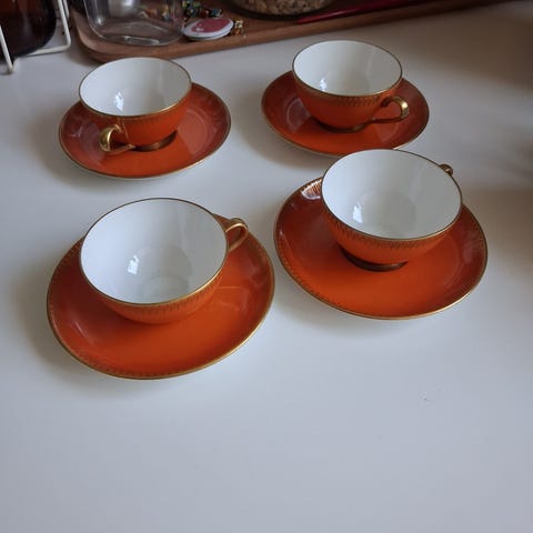 Retro kaffeservis, en kopp har ett nagg. 5 koppar och 6 assietter.