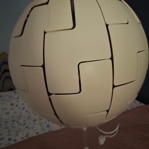 IKEA taklampa i koppar. Lampan är sfärisk med en segmenterad skärm och hängs från taket med en sladd.