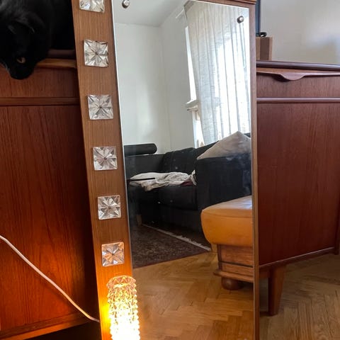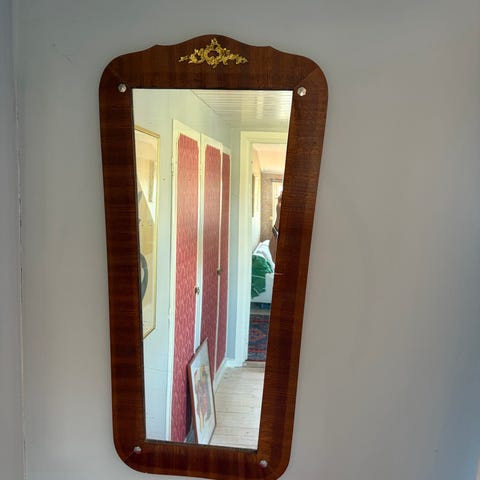 Väggspegel med fasettslipat glas och träram. Spegeln har en rektangulär form med avfasade hörn och flera fasettslipade spegelytor som ger en inramad effekt. Passar i exempelvis hall, sovrum eller vardagsrum för helkropps- eller överdelsspegling.