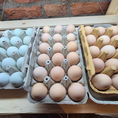 Äggkartonger i lila färg. Rymmer ett dussin ägg per kartong. Tillverkade i pappmaterial och lämpliga för förvaring och transport av ägg i hemmet eller vid försäljning. Säljs inte styckvis, hel kartong med 150st för 1200kr