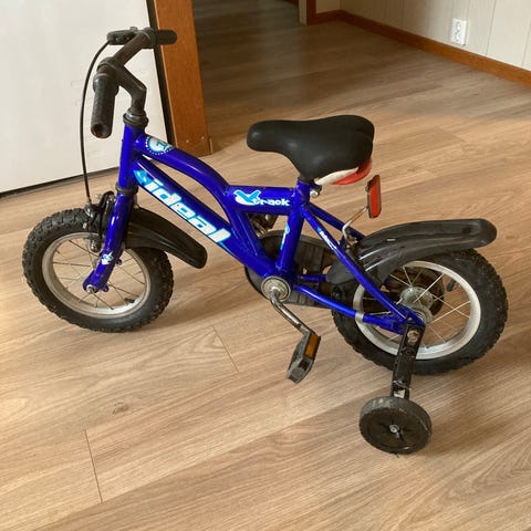 Barncykel med 12" hjul i blå färg med 2 st stödhjul och en cykelstång!