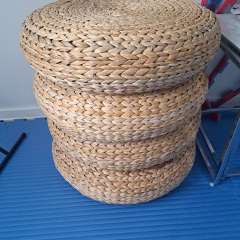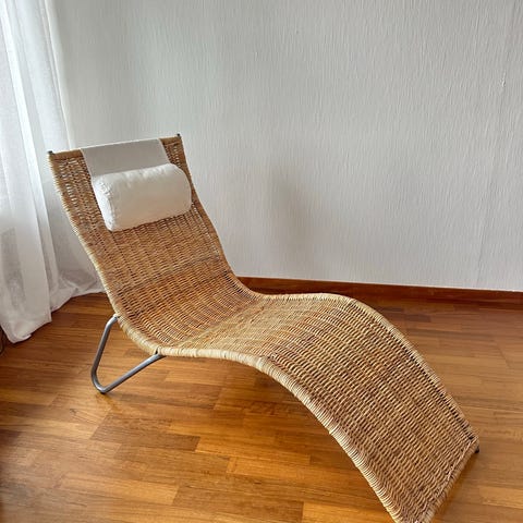 IKEA fåtölj/gungstol i flätat naturmaterial i brunmelerad ton. Låg sittdel med integrerat ryggstöd som går upp i ett handtag med öppning, vilket gör den enkel att flytta. Passar som extra sittplats i vardagsrum eller uterum. Naturmaterialet ger en varm och texturerad yta som kan kombineras med dynor eller filtar för ökad komfort.