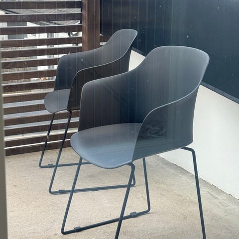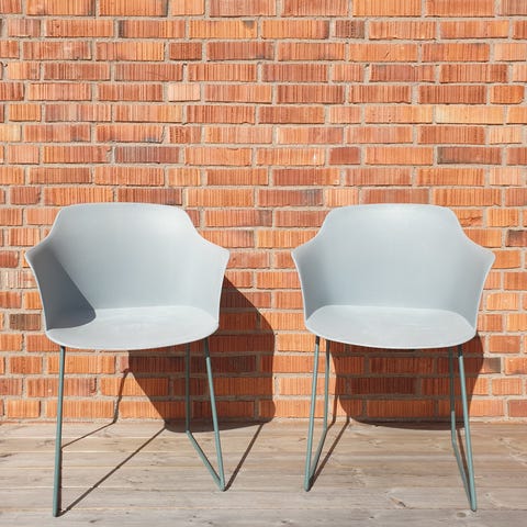 Stol i grå färg. Stolen har helgjuten sits och ryggstöd med smala metallben. Passar för användning både inomhus och utomhus, exempelvis vid matbord, uteplats eller altan.