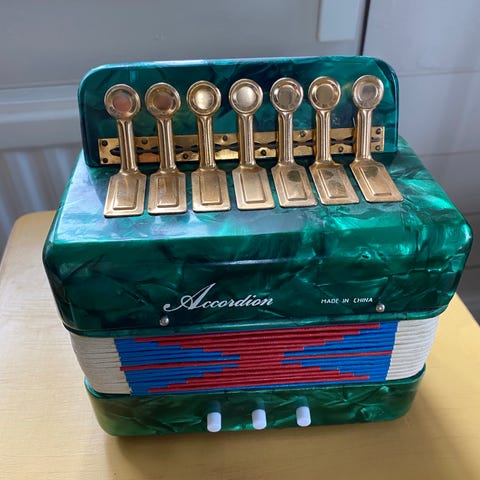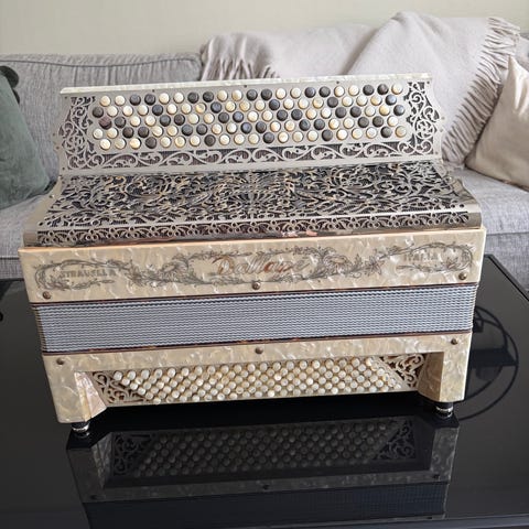 Ett gammalt dragspel ursprungligen från Ryssland eller ungen. Jag är 45 och minns det som barn. Morfar va speleman.