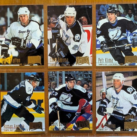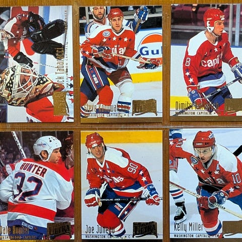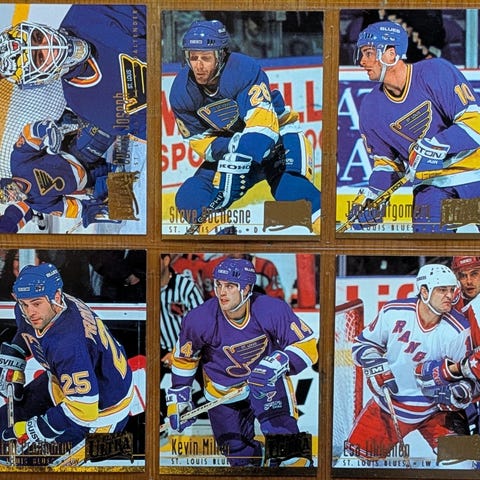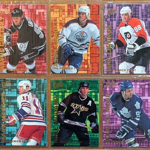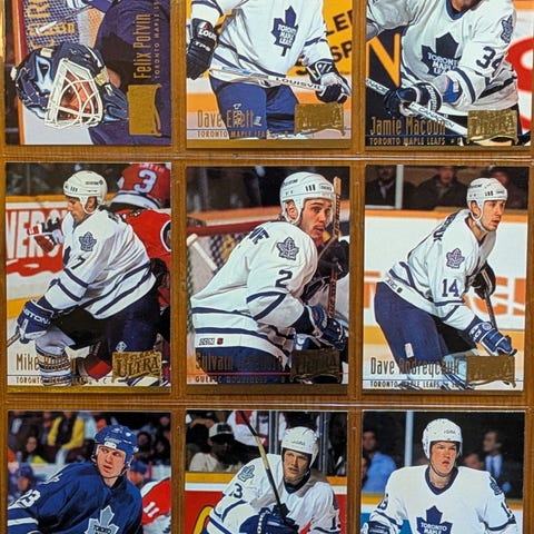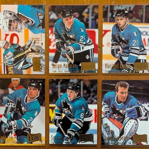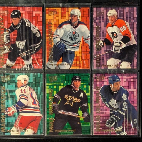 Säljer ett exklusivt set med sex originalkort från den hyllade serien Fleer Ultra 1994-95. Detta är "Award Winner"-kort som hyllar ligans bästa spelare från säsongen 93-94. Korten har en unik dubbeldesign med både porträtt och actionbild, samt den klassiska guldfolieringen.Spelare i setet:Dominik Hasek (#251) – Vezina Trophy-vinnare (Bästa målvakt).Martin Brodeur (#250) – Calder Trophy-vinnare (Årets rookie).Sergei Fedorov (#253) – Hart Trophy-vinnare (MVP).Brian Leetch (#252) – Conn Smythe-vinnare (Slutspelets MVP).Adam Graves (#254) – King Clancy-vinnare (Ledarskap).Cam Neely (#249) – Bill Masterton-vinnare (Kämparanda).Skick:Korten är i toppskick (Near Mint) med skarpa hörn och perfekt bevarad glans i guldfolieringen. Ett unikt tillfälle för samlaren!