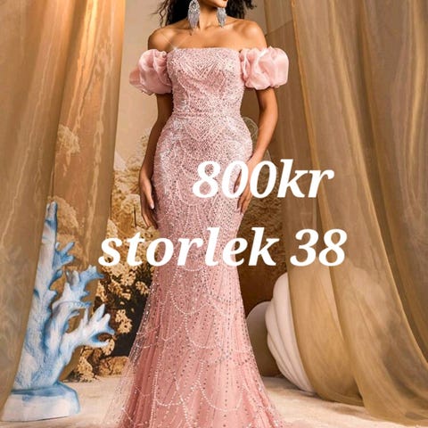 festklänning i storlek 38. Klänningen är flerfärgad med en kombination av ljus bas och mörkare kontrastpartier. Modellen är ärmlös med smala axelband och har en lång, figurnära passform med släp. Dekorativa detaljer längs överdel och sidor ger ett markerat uttryck. Passar för festliga tillfällen som bröllop, bal eller andra högtider.