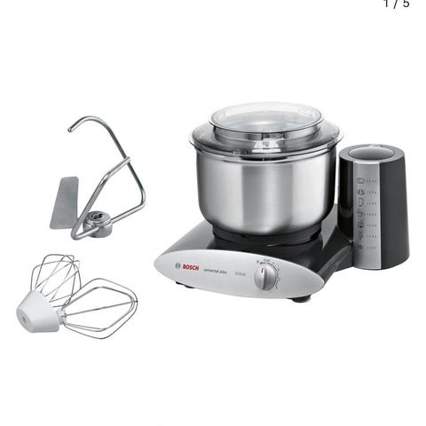 Bosch köksmaskin med rostfri bunke 6.5 liter och transparent lock. Maskinen har vred för hastighetsinställning på framsidan och symboler som visar olika användningsområden, till exempel deg- och rörelsefunktioner. Utrustad med degkrok/omrörare i bunken och elsladd med vanlig stickpropp. Passar för bakning, matlagning och blandning av olika ingredienser i hemmet.