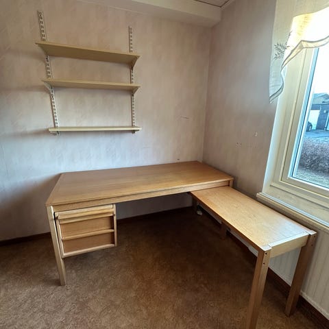 Lätt att dela i 4 delar . Höj/sänkbart genom att skruva på fötterna 56-76 cm. Skrivbordsstol och golvskydd kan ni få till. Ta med bärhjälp.