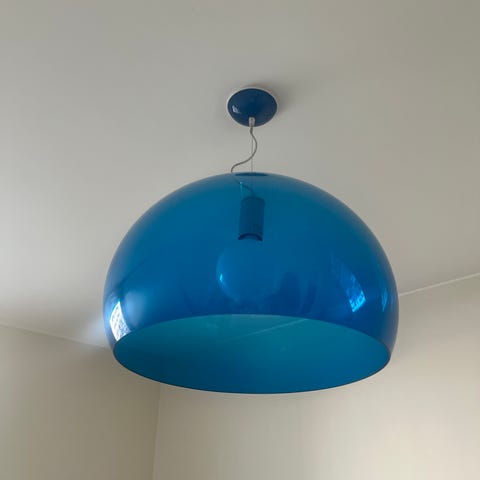 Taklampa Fly från Kartell i grön akryl. Upphängningsvajern och kabeln är inte kapad.