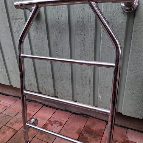 Väggmonterad handdukstork i metall med silverfärgad yta. Modellen har S-formade rör och flera fästpunkter för montering på vägg. Utrustad med elektrisk anslutning i nederkant. Passar för torkning och uppvärmning av handdukar i badrum eller tvättutrymme.