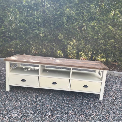 AAKIRKEBY. En stabil tv bänk i vit hög glans med två rymliga välfungerande lådor och två öppna hyllor.