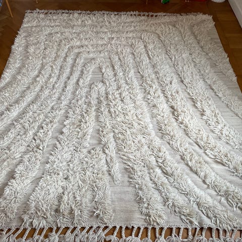 Otrolig matta i 100% off white ull. Handvävd i Marocko enligt traditionell berberteknik. Beni Ourain. Typiska mattor hos formgivare som Alvar Aalto, Donald Judd och Frank Lloyd Wright. Mönster i form av svarta kors. Ungefärligt mått 3x2m. Finns att hämta i Hammarbyhöjden. Kan även skickas.