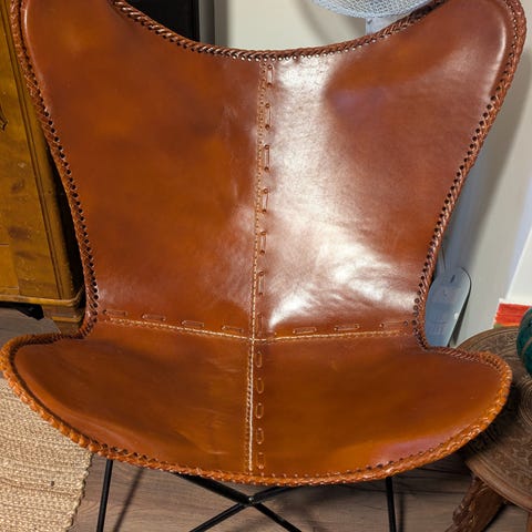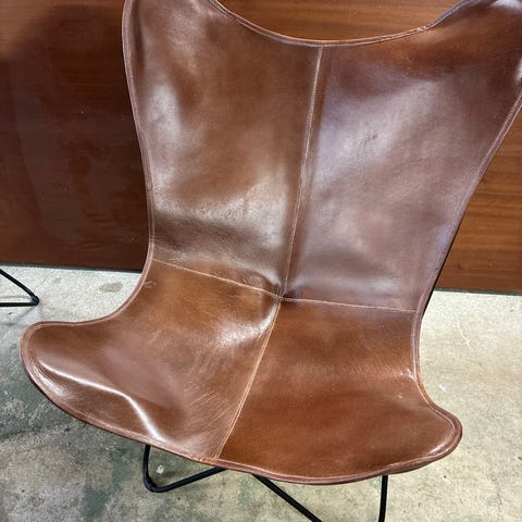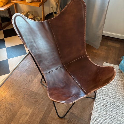 Fladdermus-fåtölj i brun läderklädsel. Sits och rygg består av ett sammanhängande läderstycke med dekorativa sömmar och kantdetaljer. Underrede i svart metall med korslagda ben som ger en luftig konstruktion. Passar som sittmöbel i vardagsrum, sovrum eller läshörna.