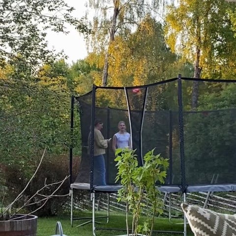 Rektangulär utomhustrampolin ca 4x2,5 m med säkerhetsnät runt hela hoppytan. Trampolinen har vadderad kant runt ramen och stege för enkel åtkomst. Passar för användning i trädgård eller på tomt som fritidsaktivitet. Finns utanför Ljungsbro.
