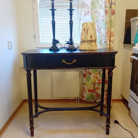 Skrivbord med klaff i mörkt trä. Bordet har en rektangulär bordsskiva med utfällbara klaffar på sidorna och en kraftig centrumpelare som avslutas i fyrdelad fot. Träet har markerad ådring och en mörk ytbehandling. Passar som arbetsbord eller mindre matbord i exempelvis vardagsrum, arbetsrum eller sovrum.